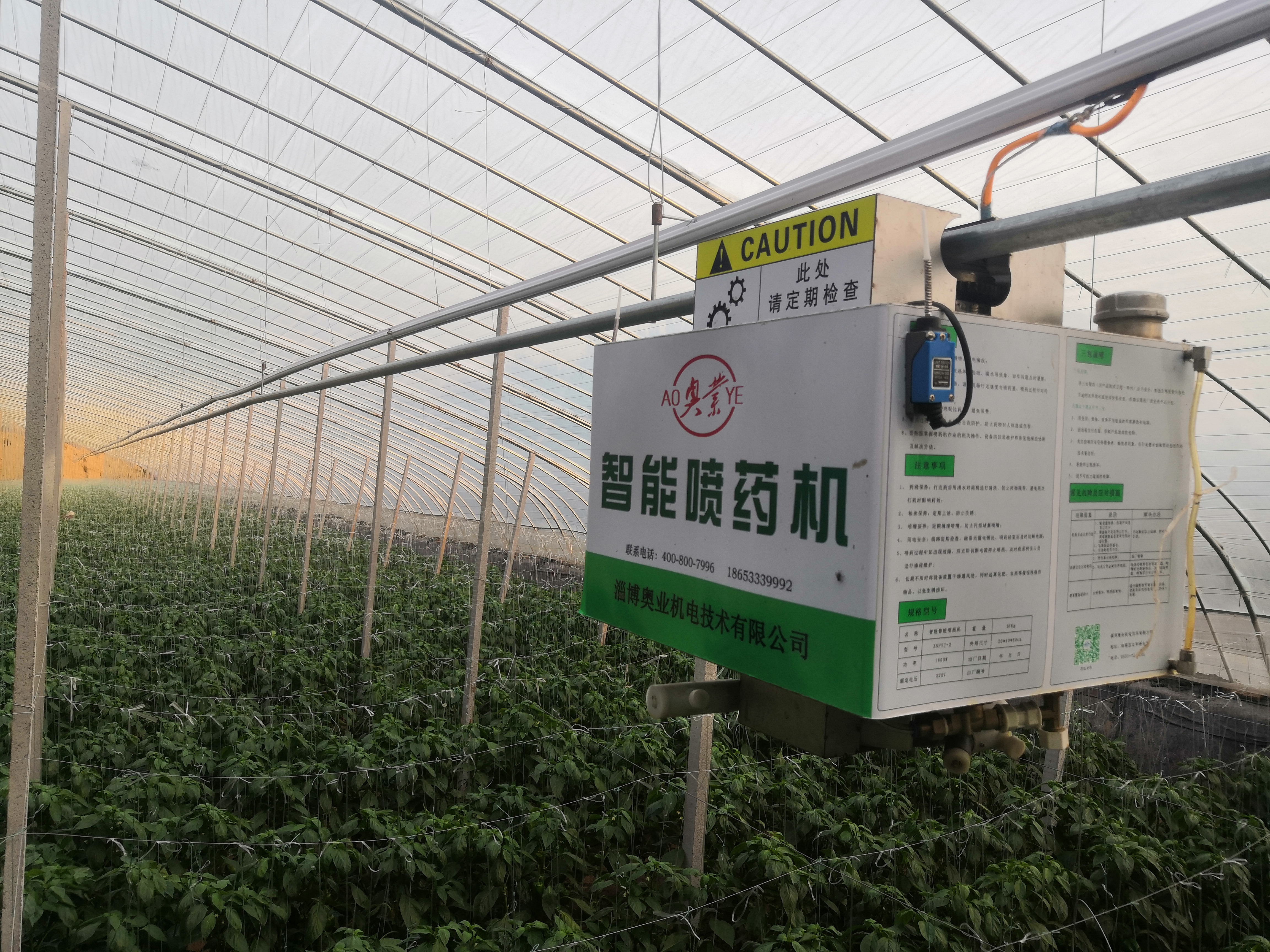 大棚智能肥藥機是淄博奧業(yè)機電技術(shù)有限公司2016年推出的一款,獲得國家發(fā)明專利(ZL201610592042.8;ZL201620789569.5;ZL201620788769.9;ZL201620788795.1;ZL201720092608.0;ZL201910297724.X;ZL201910299075.7;ZL201910298775.4;ZL201920503404.0;ZL201920503402.1;ZL201921303811.3;ZL201920504099.7;ZL201920511036.4;ZL201920503449.8;ZL201930175752.5 )的新型大棚植保裝備,這款產(chǎn)品是根據(jù)與利用棚室架構(gòu)和環(huán)境特點,采用軌道自行,高濃度射流噴霧灑式方式的新型噴藥機。實現(xiàn)了智能控制,風(fēng)動漂移粘著,消除蟲、菌寄主,提升肥藥利用率的功能。